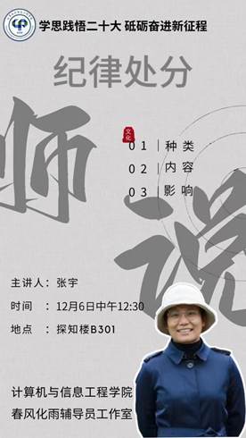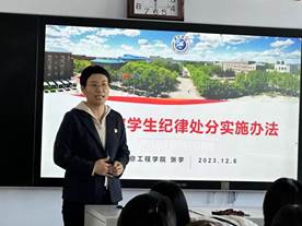 为增强学生的纪律意识,提高学生自我约束能力,帮助学生树立正确的行为准则,2023年12月6日中午12点半,计算机与信息工程学院在探知楼B301教室开展讲座,辅导员张宇主讲,本次讲座主题是《黑河学院学生纪律处分实施办法》。
