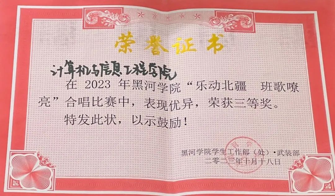 为丰富同学们的校园文化生活,促进同学们美育素养的进一步提升,计算机与信息工程学院积极组织同学们参加由校学生工作处举办的“乐动北疆,班歌嘹亮”合唱比赛,在10月18日的合唱决赛中,最终以《万疆》和《我相信》两首曲目荣获全校第四名,收获了三等奖。