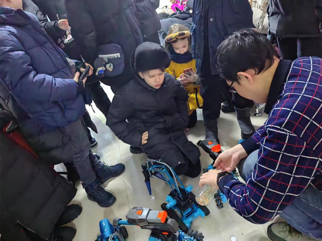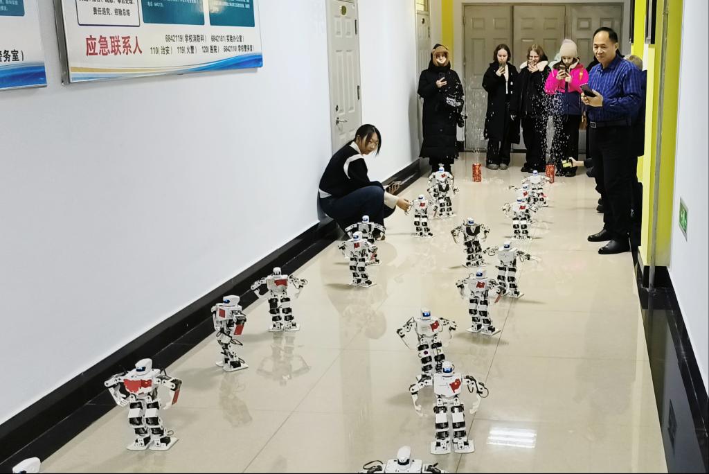在走廊里,带领俄罗斯的“小北极熊”体验了遥控车、ros竞速小车、“三宝”同学、跳舞机器人和探索者小车。他们纷纷表示这些科技非常有意思,激起了他们对于科技机器人等方面的兴趣,同时他们与中国学生、三宝同学共同跳舞。..