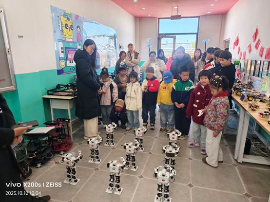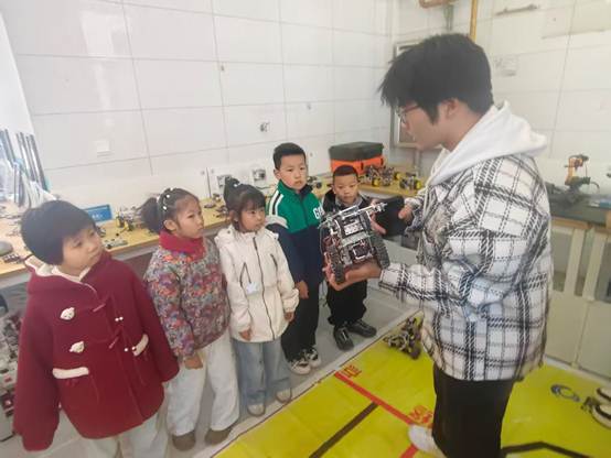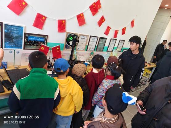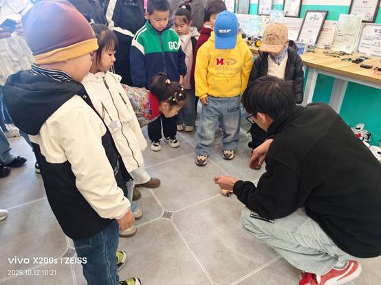 活动伊始,计算机学生化身“小老师”,用生动易懂的语言为小学生们讲解人工智能与机器人的基本原理。为避免抽象概念让孩子们感到枯燥,社团精心准备了“机器人小剧场”——会跳舞的人形机器人随着音乐扭动肢体,智能避障小车灵活穿梭过障碍物,巡逻机器人精准识别指定目标,每一个精彩演示都引来孩子们的阵阵欢呼与惊叹。社团成员还耐心解答孩子们的疑问,“机器人能听懂所有话吗?”“小车是怎么知道前面有东西的?”面对充满童趣的问题,社团成员结合实物拆解与动画演示,将复杂的技术知识转化为孩子们能理解的生活常识。