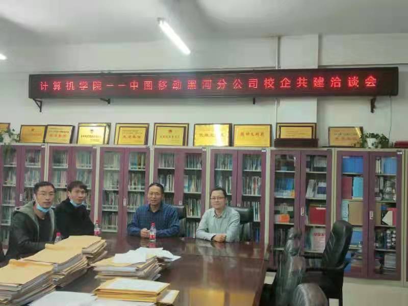 2021年10月14日下午15:30,计算机与信息工程学院负责人刘心声、信息工程系主任刘平同志与中国移动黑河分公司大项目经理孙涛、网络工程部高星星同志就通信工程专业共建事宜进行了推进协商。